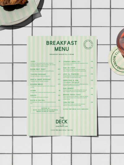 To attract more clients to the club ‘The Deck’ at The Bundanoon Club was established as an casual outdoor-dining addition to the club. ‘The Deck’ was designed with a summer aesthetic that was relaxed and youthful to attract a younger demographic to the club. Made Somewhere worked on the branding, signage, menus and social media for ‘The Deck’.